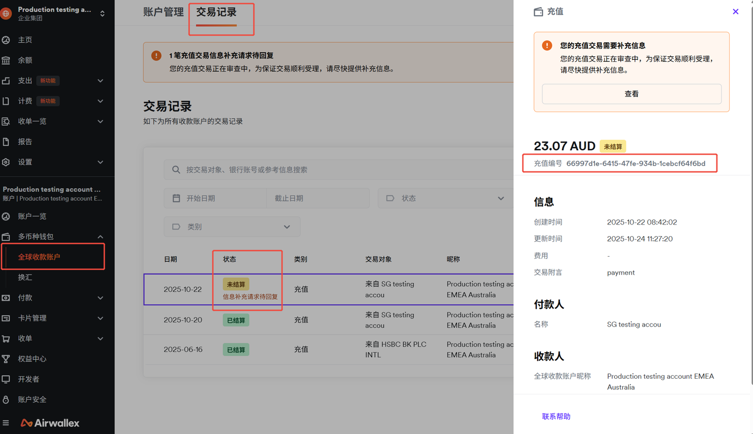 为什么我的空中云汇入账资金还未结算?发表时间:2025-11-24 09:17 只有已结算的入账才会显示在您的钱包余额中。某些情况可能导致结算不成功,我们建议您前往全球收款账户 > 交易记录查看所有入账交易——包括已结算和未结算的入账。