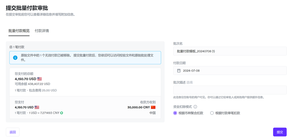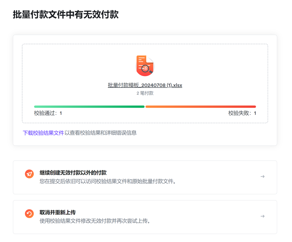 如何处理“部分预定”或“预定失败”的批量付款?在极少数情况下,批量付款可能会预定失败(例如,您创建或批准批量付款后,其他交易或扣款发生,导致钱包余额不足等情况),或部分预定(例如,人民币本地转账限额未能满足某些付款要求)。您可以通过下载批量付款详情页顶部错误横幅中提供的详情文件,查看未预定成功的付款,并使用该文件创建新的批量付款。